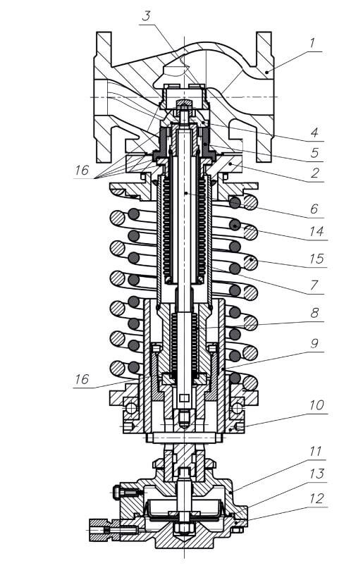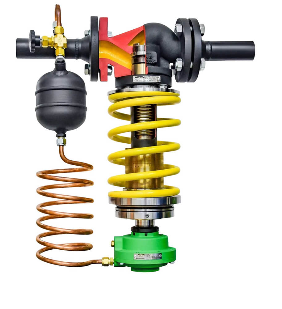 ASTA D200 is a direct-acting single-seat valve with a bellows seal, designed to automatically maintain a given pressure of the working medium, the operating principle of which is based on balancing the force of elastic deformation of the adjustment spring and the force created by the pressure difference in the chambers of the diaphragm actuator