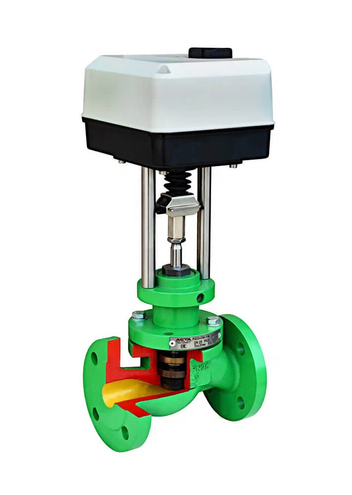 АСТА Р223 ТЕРМОКОМПАКТ — односедельный двухходовой регулирующий клапан облегченной конструкции, управляемый электрическим приводом, предназначенный для точного дистанционного регулирования или перекрытия потока рабочей среды.