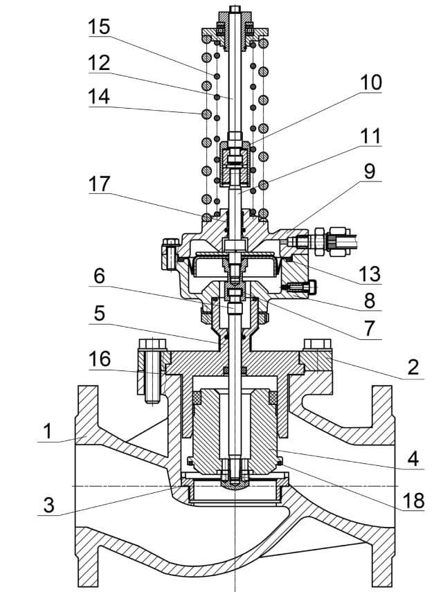АСТА Д100 ― односедельный клапан прямого действия, предназначен для автоматического поддержания заданного давления рабочей среды, принцип действия которого основан на уравновешивании силы упругой деформации настроечной пружины и силы, создаваемой разностью давлений в камерах мембранного привода.