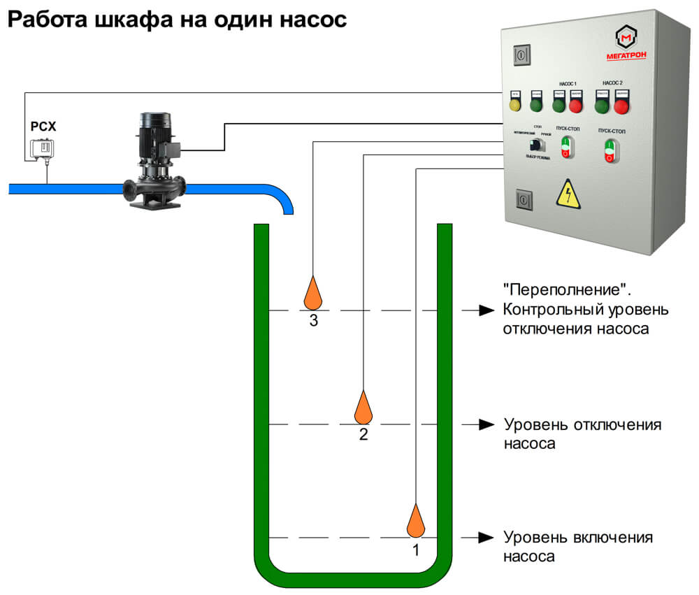 Автоматический режим — работа строится на основе внешних релейных сигналов, которые коррелируют с текущим уровнем жидкости.