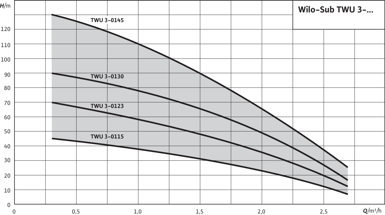 | Sub TWU 3-0145 (3~400 V, 50 Hz) | 3~400 V, 50 Hz | 76 mm | 129.8 m | 2.7 m³/ч | 1.10 kW | 15.4 kg | 4090895 |