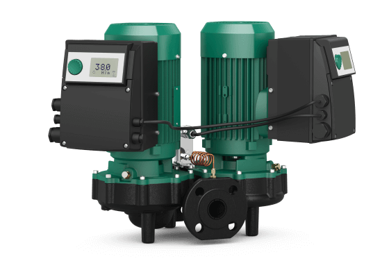 Electronically regulated, flange-mounted, dry-running, self-priming twin pump in Inline design