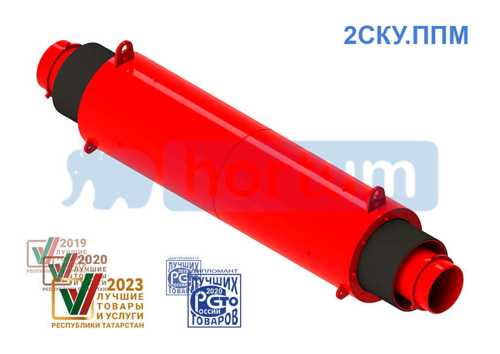 Two-section bellows compensating device with heat- and water-insulated bellows and a sleeve in a polyethylene sheath for PPM insulation.