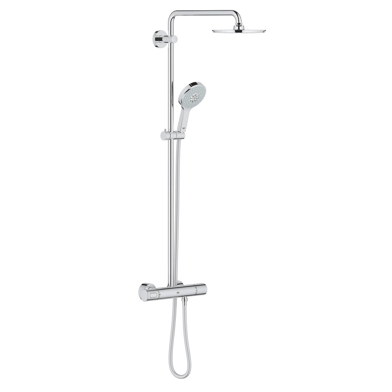 perfect for a relaxing head and neck massage. For both shower heads, the nozzles are made of soft silicone that resists lime deposits and makes it easy to keep clean. The thermostat uses GROHE CoolTouch technology to prevent heat build-up and therefore burns. Install this powerful shower system in your bathroom and enjoy a relaxing shower at a pleasant temperature with almost half the water consumption thanks to GROHE EcoJoy technology.
