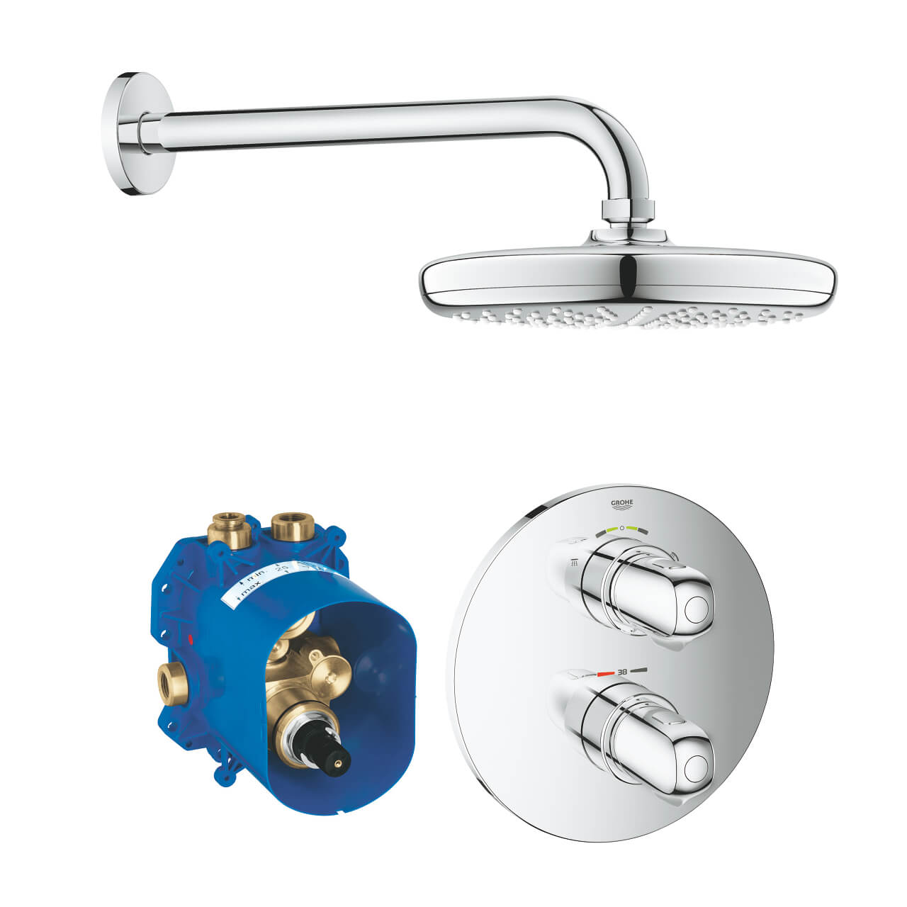 ShockProof ring that will protect the shower from damage when falling. The set also includes a Rotaflex shower hose with TwistFree function and a length of 1500 mm. The Eco Aquadimmer lets you control the water flow while directing the water flow between the overhead shower and the hand shower. Standard mode cuts water consumption in half, but you can press the GROHE EcoButton for a luxurious flow of water. You can save money by lowering your water bill and still get great water flow without sacrificing shower comfort. Silicone shower nozzles are easy to clean of dirt and limescale thanks to the SpeedClean technology. With a multi-layer, scratch-resistant chrome finish, GROHE StarLight will keep its shine for years to come. The internal WaterGuide will prevent the shower surface from heating up. The set also includes a Rainshower shower arm (286 mm) and a shower connection. Grohtherm 1000 Perfect shower set - style and functionality in the shower!