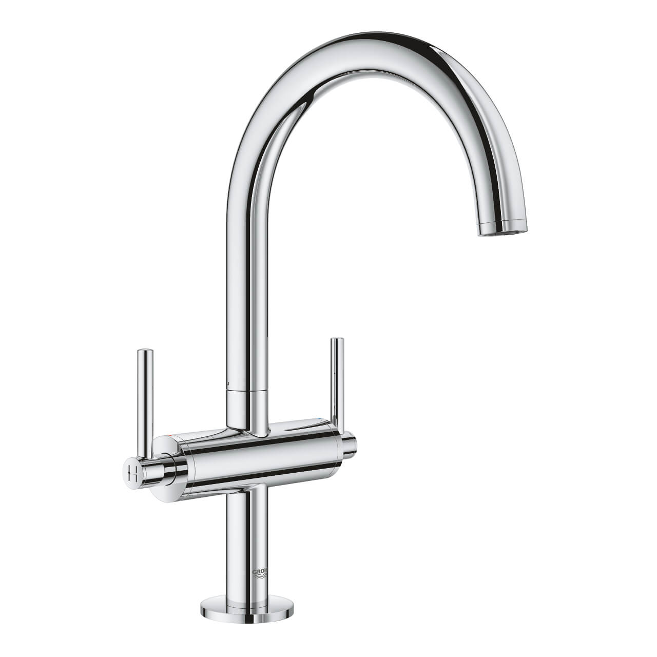 Perfectly shaped, visually elegantly curved The GROHE Atrio 2-valve basin mixer was designed to function perfectly and bring a satisfying ambience to your modern, high-quality bathroom. Two die-cast metal handles provide precise control while being both reliable and durable. The kit includes a set of nozzles with unobtrusive "H" markings and "C", as well as a set without inscriptions. Monoblock high C-spout