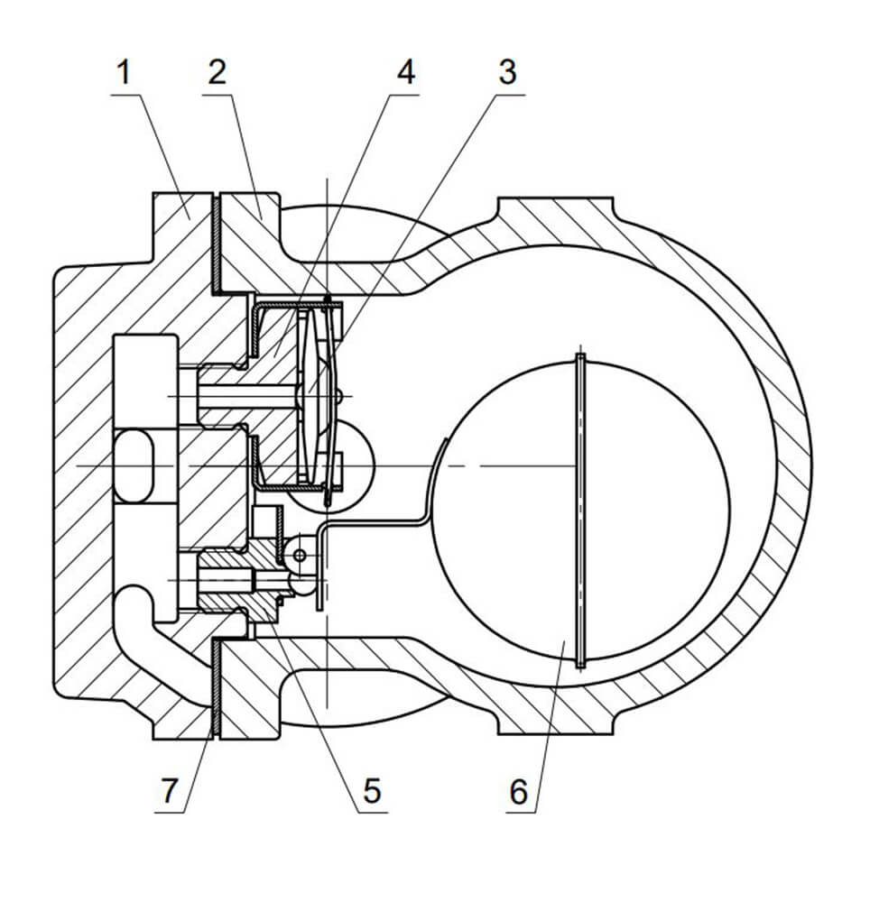 | 1 | Корпус | Высокопрочный чугун ВЧ40 | 2 | Крышка | Высокопрочный чугун ВЧ40 | 3 | Капсула | Нержавеющая сталь 08Х18Н10 | 4 | Седло воздухоотводчика | Нержавеющая сталь 20Х13 | 5 | Седло конденсатоотводчика | Нержавеющая сталь 20Х13 | 6 | Поплавок | Нержавеющая сталь 08Х18Н10 | 7 | Прокладка корпуса | Графит |