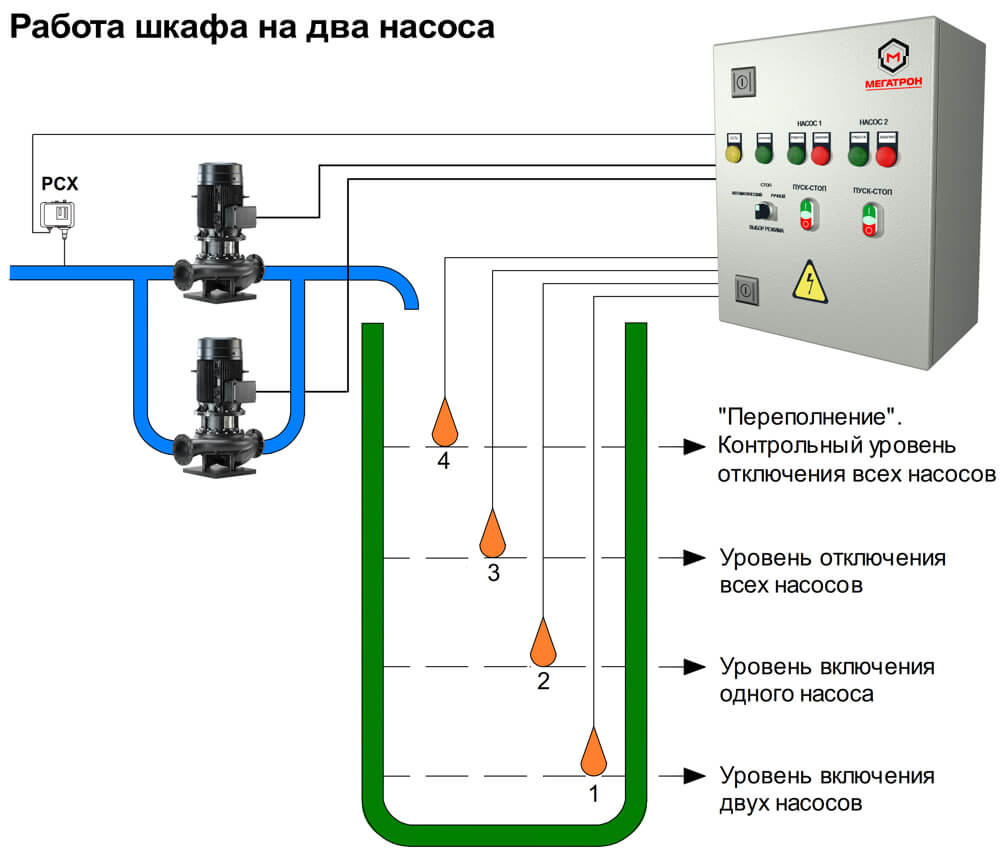 Автоматический режим — работа строится на основе внешних релейных сигналов, которые коррелируют с текущим уровнем жидкости.