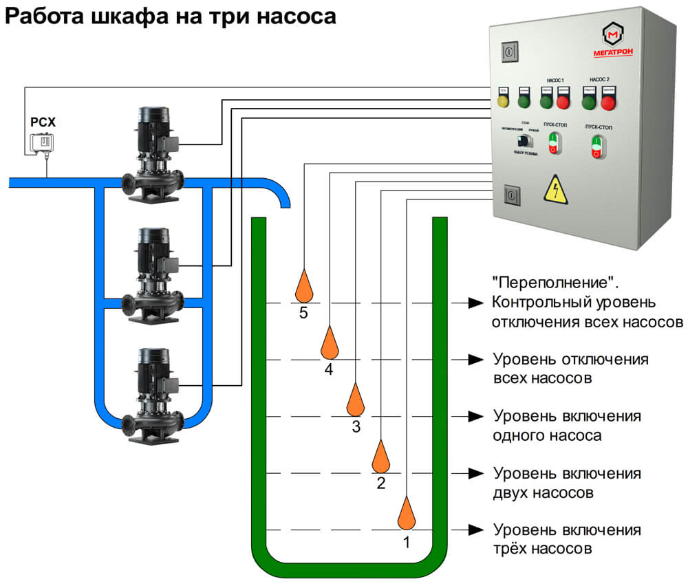 - По мере дальнейшего понижения уровня жидкости система поэтапно запускает дополнительные насосы — каждый при срабатывании очередного поплавка.