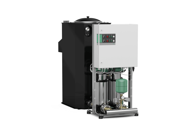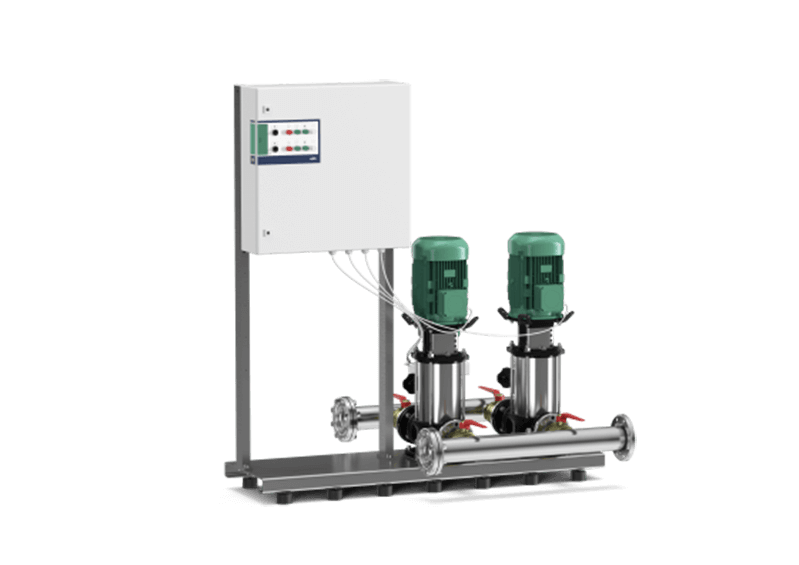 С 2 вертикальными многоступенчатым высоконапорными центробежными насосами из нержавеющей стали с сухим ротором и приемным резервуаром.