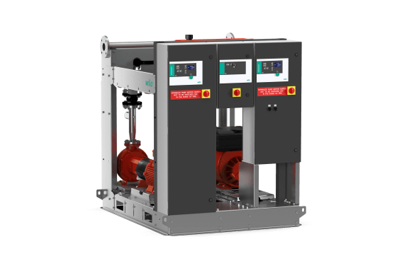 В зависимости от модели содержит 1 или 2 насоса с горизонтальной фундаментной рамой (EN 733), со сменной муфтой, электрическим или дизельным двигателем и многоступенчатым вертикальным электрическим подпитывающим насосом.