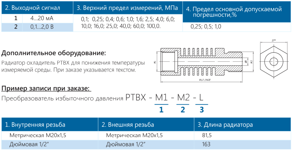 Радиатор-охладитель РТВХ (далее — радиатор) предназначен для расширения эксплуатационных характеристик преобразователей давления и устанавливается перед преобразователем давления, в случае если температура измеряемой жидкости или пара превышает значение 125 °С.